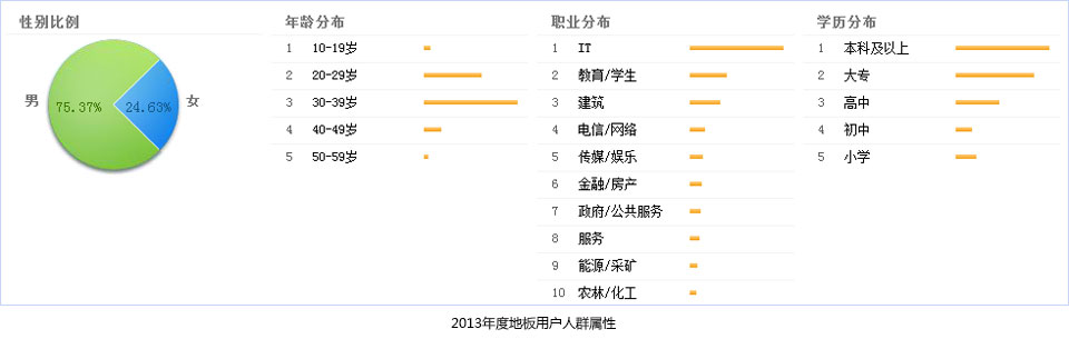 根据上图数据分析,地板互联网用户男性占据75.37%,女性占据24.63%,由此说明:关注地板行业的人群以男性为主;