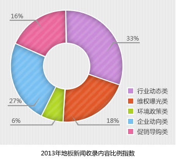 截止12月13日,2013年"地板"百度新闻收录总量5,850,000篇,其中信息量较多的前五类新闻内容比例情况如下: